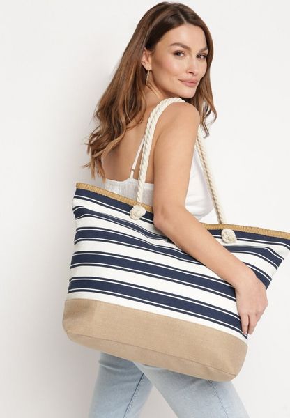 Beżowo-Granatowa Plażowa Torebka Shopper z Rączkami ze Sznurka Wykończona Plecionką Zapinana na Suwak Linneli