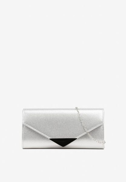 Srebrna Torebka Kopertówka z Łańcuszkiem Zdobiona Metaliczną Aplikacją Idalinna