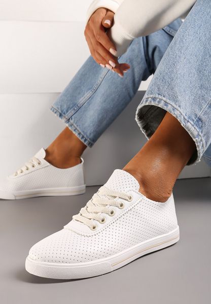 Biało-Beżowe Płaskie Sznurowane Tenisówki przed Kostkę Ozdobione Perforacją Serettia