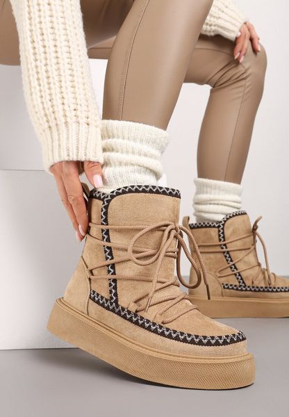 Beżowe Wsuwane Śniegowce na Platformie z Futerkiem i Sznurowaniem Ettarie