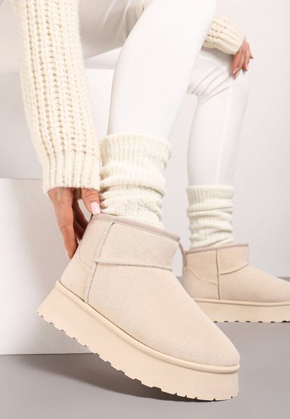 Beżowe Casualowe Śniegowce na Grubej Podeszwie o Krótkim Fasonie Lobaria