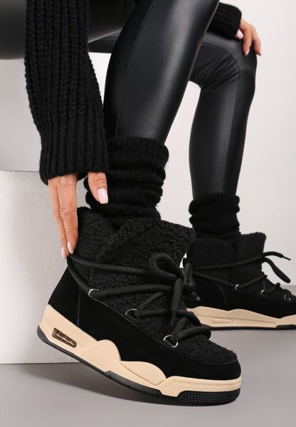 Czarne Śniegowce na Grubej Podeszwie ze Sznurowaniem i Futerkiem Typu Baranek Miarion