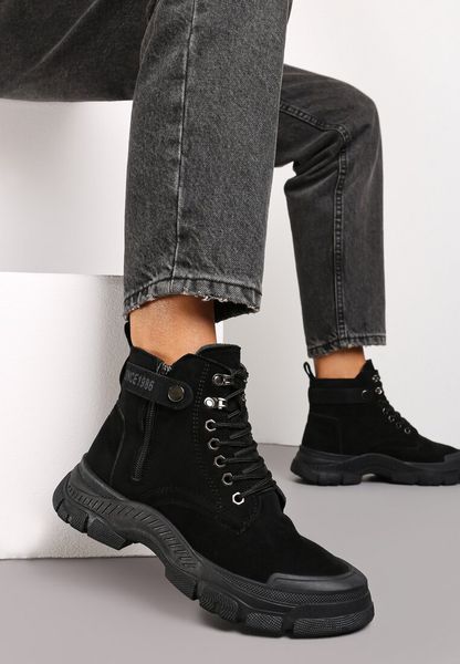 Czarne Sznurowane Traperki z Ekozamszu z Suwakiem i Paskiem z Napisami Dikofena