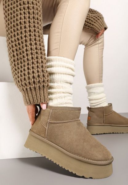 Ciemnobeżowe Śniegowce ze Skóry Naturalnej na Grubej Podeszwie Ocieplane Futerkiem Evorira