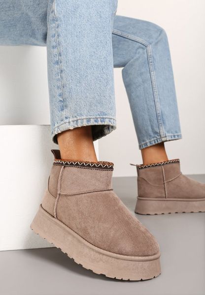 Ciemnobeżowe Wsuwane Śniegowce na Grubej Podeszwie z Ozdobnym Haftem i Niską Cholewką Serira