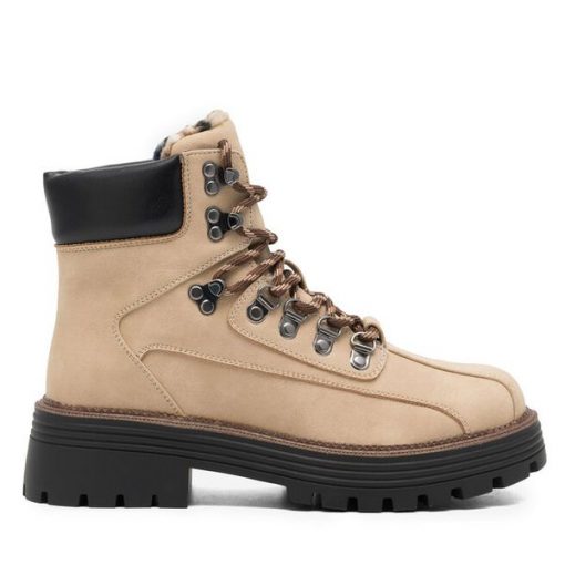 Beżowe Trapery ze Sznurowaną Cholewką z Futrem Zdobione Wstawką przy Podeszwie Nelothiel
