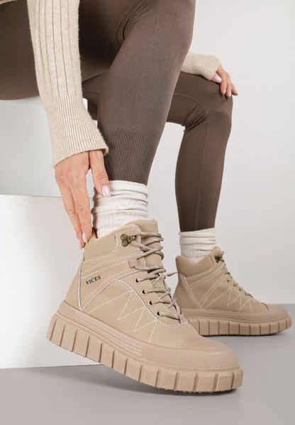 Ciemnobeżowe Botki Trapery Vices na Grubej Tłoczonej Podeszwie z Przeszyciami Amarrise