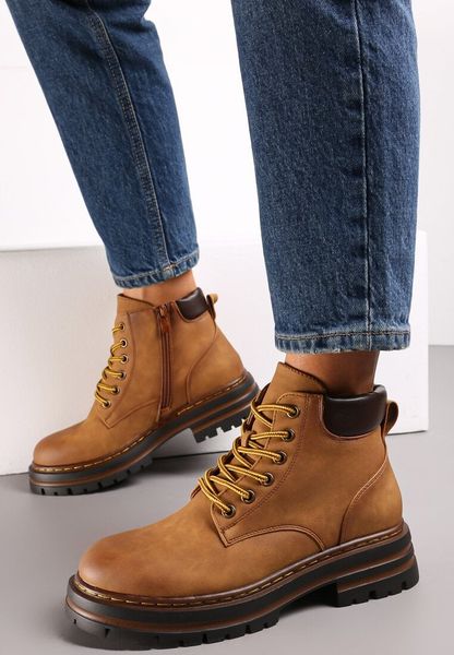 Brązowe Sznurowane Traperki z Ekozamszu z Suwakiem i Paskiem z Napisami Dikofena