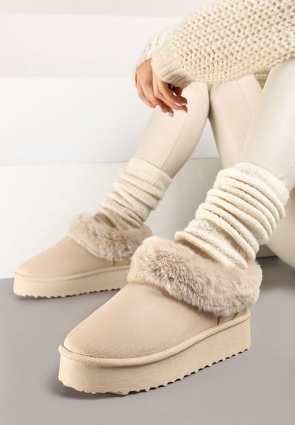 Beżowe Śniegowce na Grubej Podeszwie z Futerkiem i Niską Cholewką Vertitana