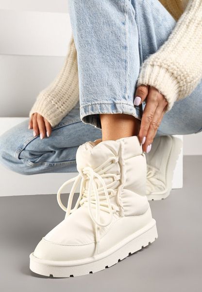 Białe Ocieplone Śniegowce Wsuwane z Ozdobnym Napisem i Sznurowaniem Nalissa