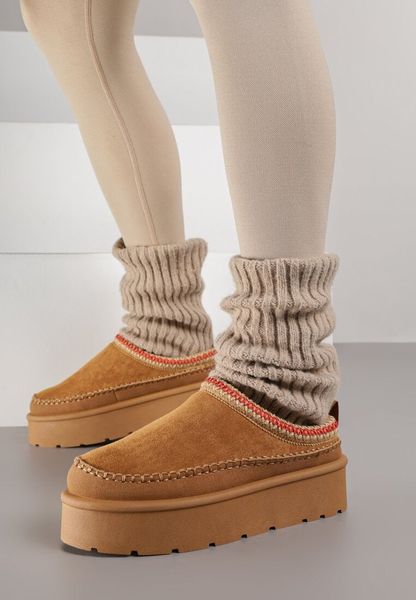 Jasnobrązowe Śniegowce Ocieplone na Platformie z Ozdobnym Wyszywaniem Reitenna