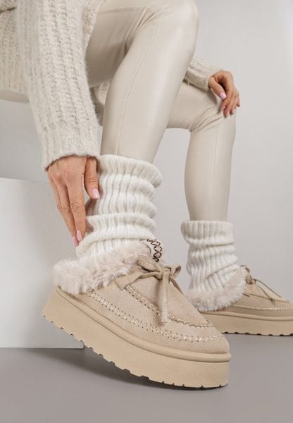 Beżowe Rustykalne Śniegowce z Niską Cholewką Zdobione Futrem i Kokardą Tuspena