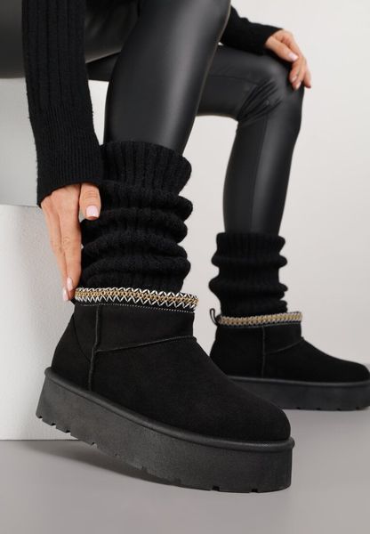 Czarne Niskie Śniegowce z Imitacji Zamszu na Platformie z Ozdobnym Haftem Ftarvia