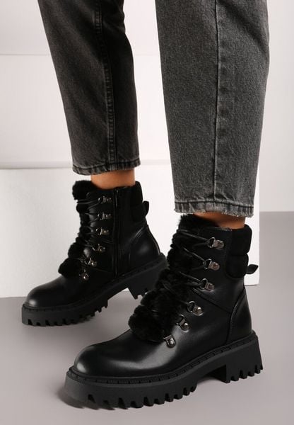 Czarne Sznurowane Traperki na Płaskiej Podeszwie Wyścielone Futerkiem Magsir