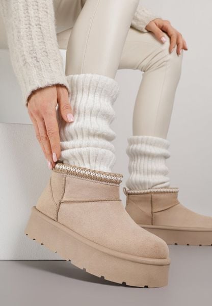 Ciemnobeżowe Śniegowce na Grubej Podeszwie Zdobione Haftem Sewnella
