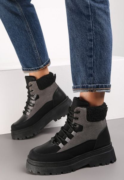 Czarno-Szare Traperki Sznurowane Trapery Janne