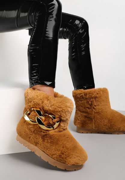 Śniegowce Dephare futrzane, ze wsuwaną cholewką sięgającą za kostkę. Osadzone na grubej podeszwie ze stabilizującym protektorem. Wykonane z miłego w dotyku, miękkiego materiału imitującego futerko. Udekorowane w tylnej części łańcuchem w złotym kolorze. Mocno ocieplane od środka imitacją futerka. Polecamy zakup rozmiaru o 1 większego. Wyglądają fenomenalnie w komplecie z kurtką typu miś!