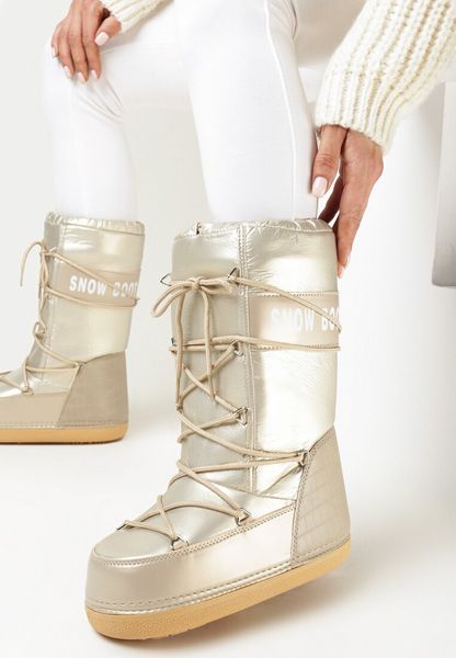 Złote Śniegowce na Grubej Podeszwie ze Ściąganą Cholewką i Sznurowaniem Betulia